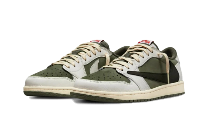 Las Air Jordan 1 Retro Low OG SP Travis Scott en color Medium Olive destacan por su combinación única de tonos verde oliva, blanco y negro, con detalles característicos como el swoosh invertido. Hechas con materiales de alta calidad, incluyen detalles de branding de Travis Scott y Jordan. Su diseño es una mezcla de estilo urbano y deportivo, con una suela cómoda y resistente. Edición limitada y codiciada por coleccionistas y fans del rapero.